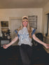 Celebrate in style with The Betsy! This denim combo top features a fun fourth of July theme, complete with a frayed edge for an extra touch of edge. Perfect for any patriotic occasion, this top will be the life of the party!
