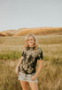 Black bleached tee with saying, "I'm With The Hippies And The Cowboys." Gildan material, super soft. Size XL Bella+Canvas.