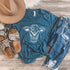 Hand doodled heifer graphic. Featuring a relaxed unisex fit, added length, and a flattering V-neck. Unisex. Buttery soft blend of cotton, rayon and polyester. Blue with white print.