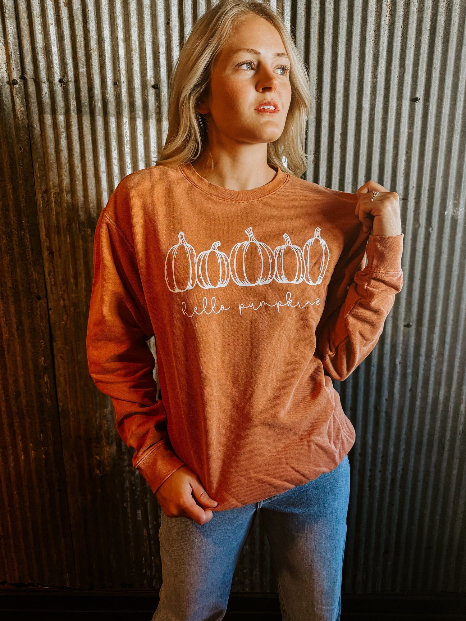 Say hello to fall with our Hello Pumpkin lightweight sweatshirt! This crew neck sweatshirt is perfect for those cool autumn days, featuring the fun phrase "Hello Pumpkin" to add a touch of playfulness to your wardrobe. Stay cozy and stylish this season with our must-have sweatshirt.