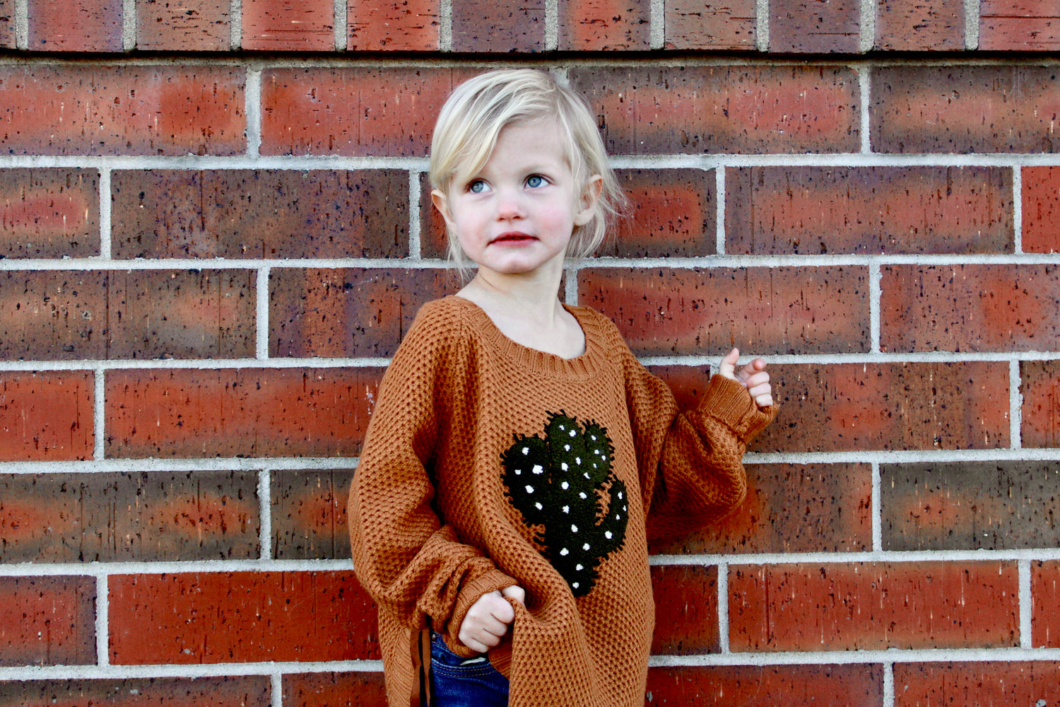 Be the Duke of your desert dreams with this cozy cactus-print kids sweater. Its soft caramel color will keep your little one looking sharp even when the temperature dips!