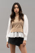 "Keep it cute and cozy with The Debbie, a khaki-colored sweater vest with a round neck and playful layered design. Perfect for adding some personality to any outfit. (Note: This sweater vest does NOT come with a Debbie attached)"