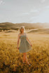 Smocked detail lined mini dress with side pockets. The straps are adjustable, but the buttons are not functional. Sage in color.