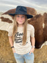 Unisex. 60% Ring spun cotton and 40% polyester makes for a buttery soft tee. Color: Dust with black graphic.