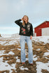 Dark denim shirt top features floral embroidery accents throughout front. Exposed button closure. Easy fit.