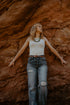 Ultra high rise 90's flare jeans with hole patches down the leg. Rise 11"; Inseam 34". Model is wearing a size 25 and usually wears a 26 or 27 and XL (34"/36") in length.