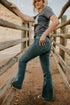 Dark wash high rise waistband with a 33" inseam flare. Stretchy material.