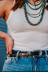 Skinny western belt made with genuine leather and matching shiny silver hardware engraved with floral designs at the belt buckle, loop, and end piece.
