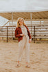 Spaghetti strap that is adjustable and has woven cotton gauze yarn dye. Taupe/white jumpsuit.